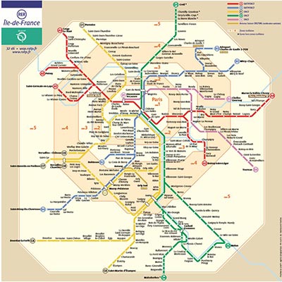 Hvis du skal til Versailles slott eller Disneyland, bør du ta RER-togene. Til høyre kan du se et kart over de fem linjene. For å komme til Versailles skal du ta RER linje C (gul), mens du skal ta RER linje A (rød) for å komme til Disneyland.